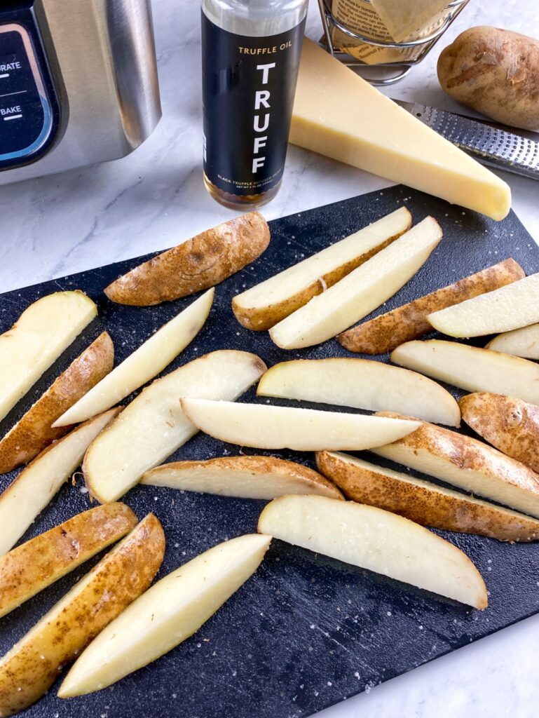 Step 5: Transfer the potato wedges to a clean work surface and drizzle with the remaining truffle oil and additional salt, if desired. Top with freshly grated Parmesan cheese and serve immediately. Enjoy!