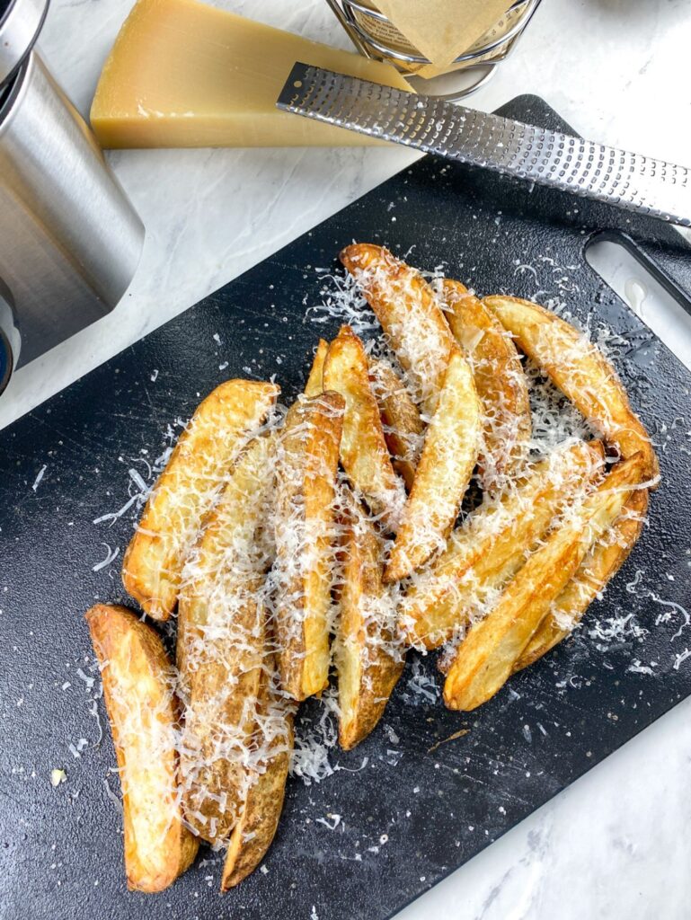Transfer the potato wedges to a clean work surface and drizzle with the remaining truffle oil and additional salt, if desired. Top with freshly grated Parmesan cheese and serve immediately. Enjoy!