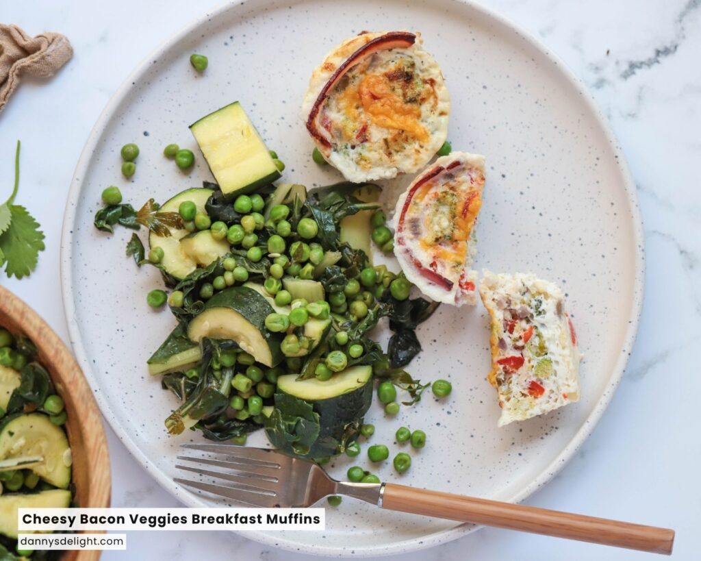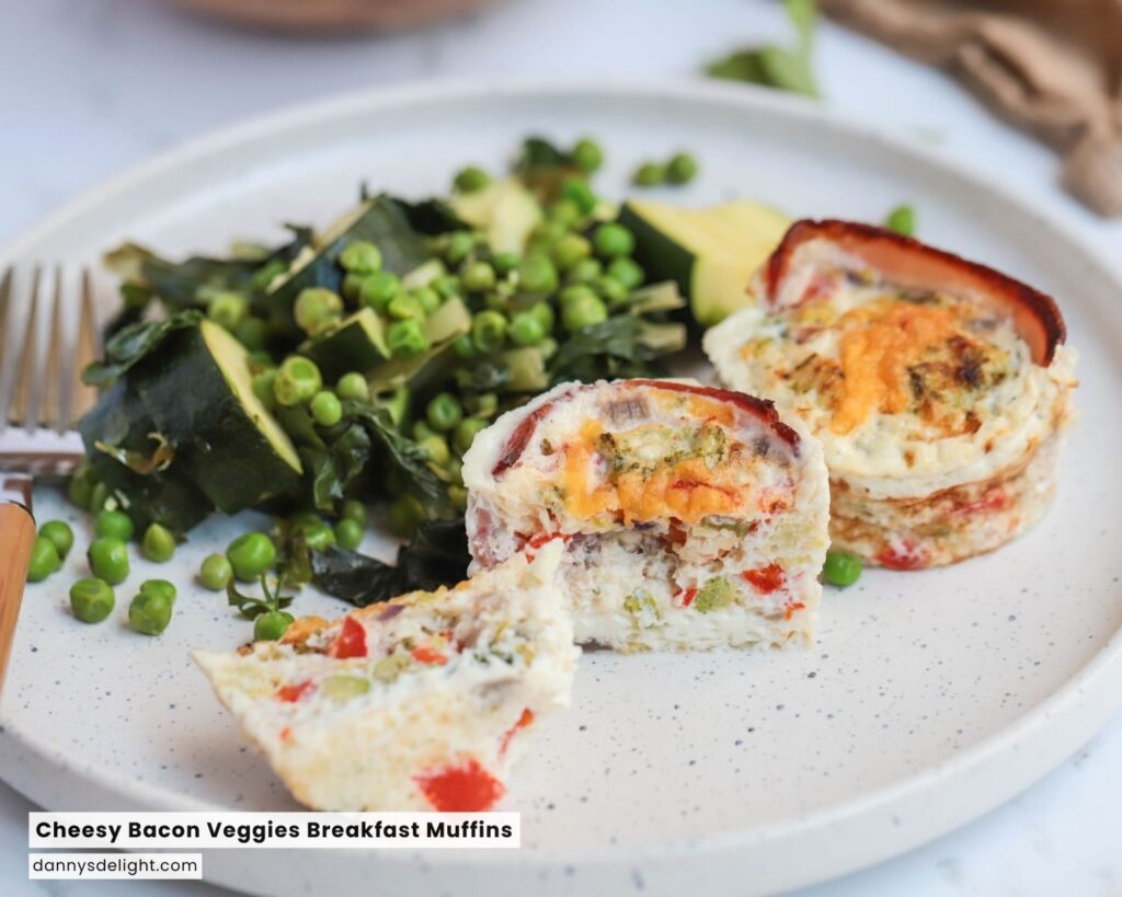 Once baked, carefully remove the muffin tin from the oven. Serve and enjoy, with a recommended serving of 2 muffins per plate. Your Cheesy Bacon and Veggies Breakfast Muffins are ready to delight your taste buds!