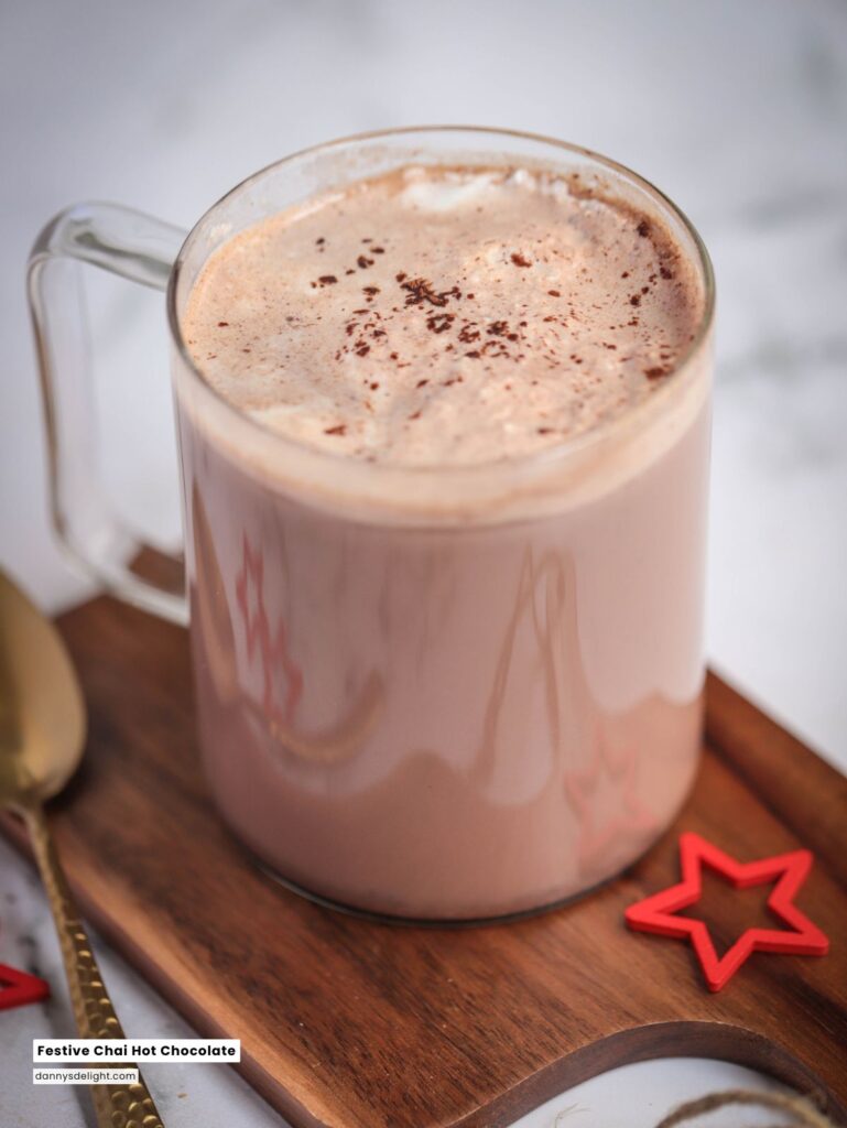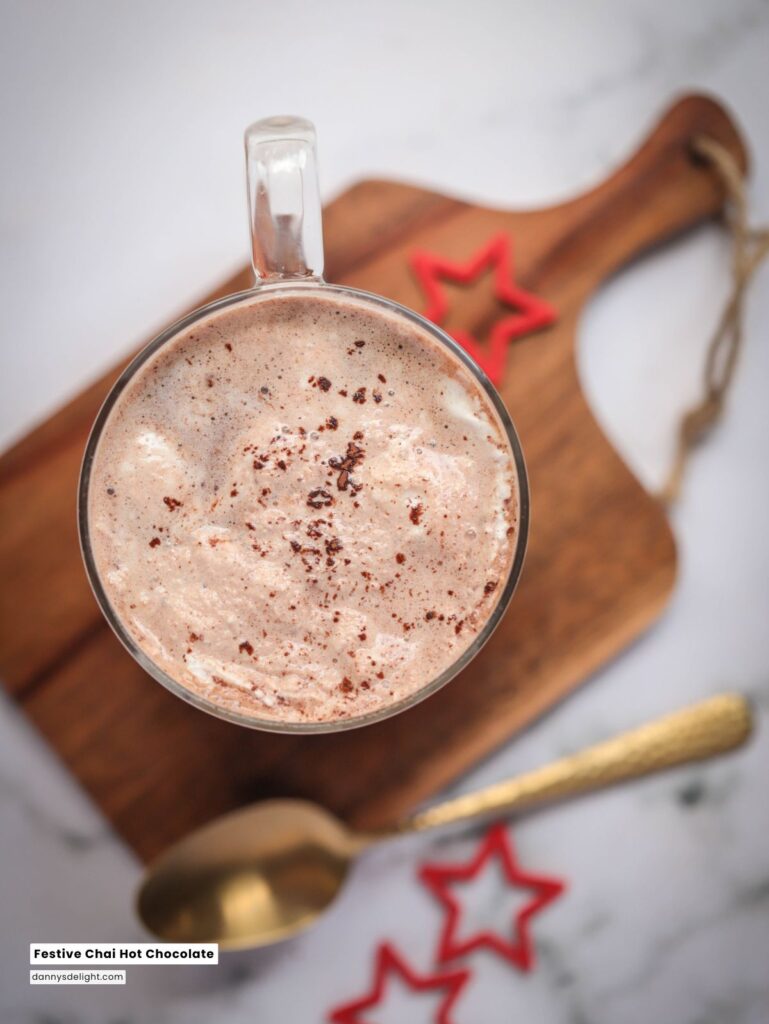 festive chai hot chocolate, holiday hot chocolate, chai spiced hot chocolate, dairy-free hot chocolate recipe, vegan chai hot chocolate, holiday drink recipe, spiced hot chocolate recipe, almond milk hot chocolate, quick festive drinks, winter drink recipe, holiday mug recipes, cozy hot chocolate recipe