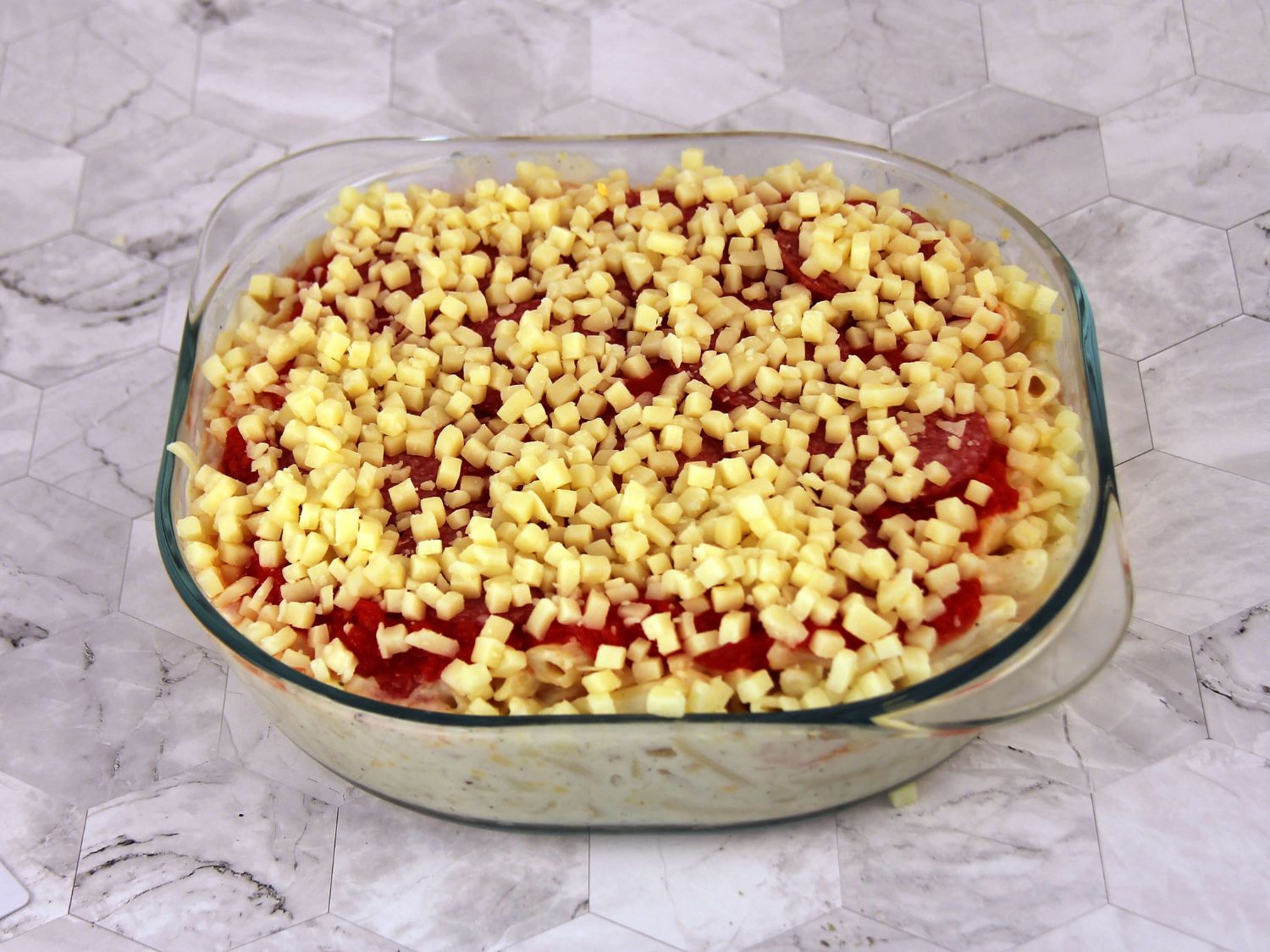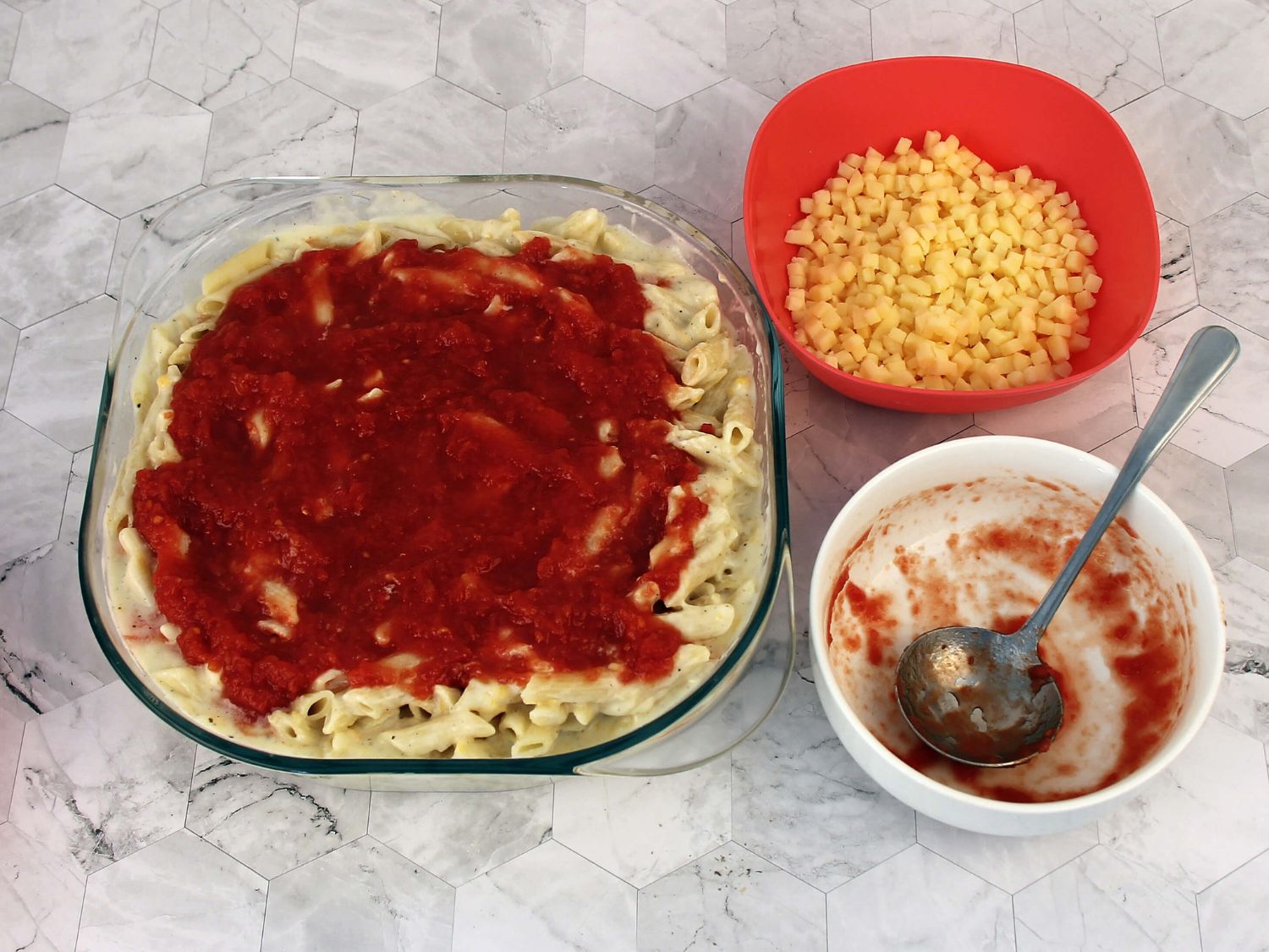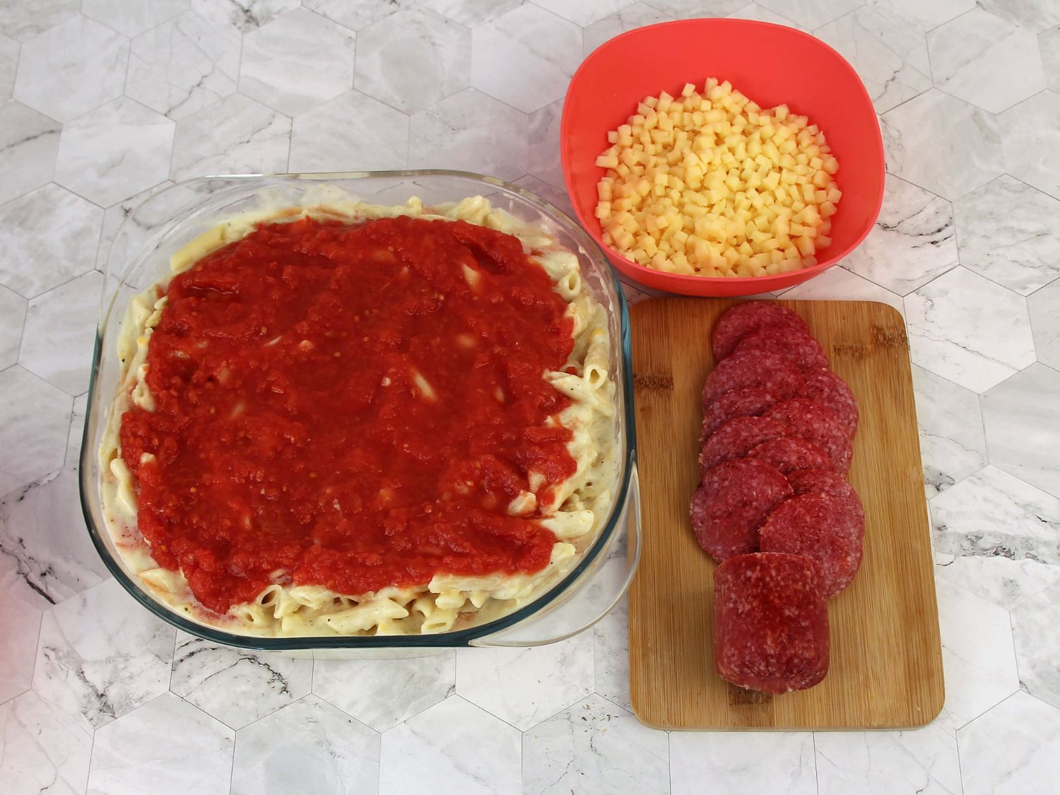 Drain the cooked pasta and combine with the cheesy sauce. Remove from heat and top with marinara, pepperoni slices, and top with marinara, pepperoni slices, and reserved fontina.
