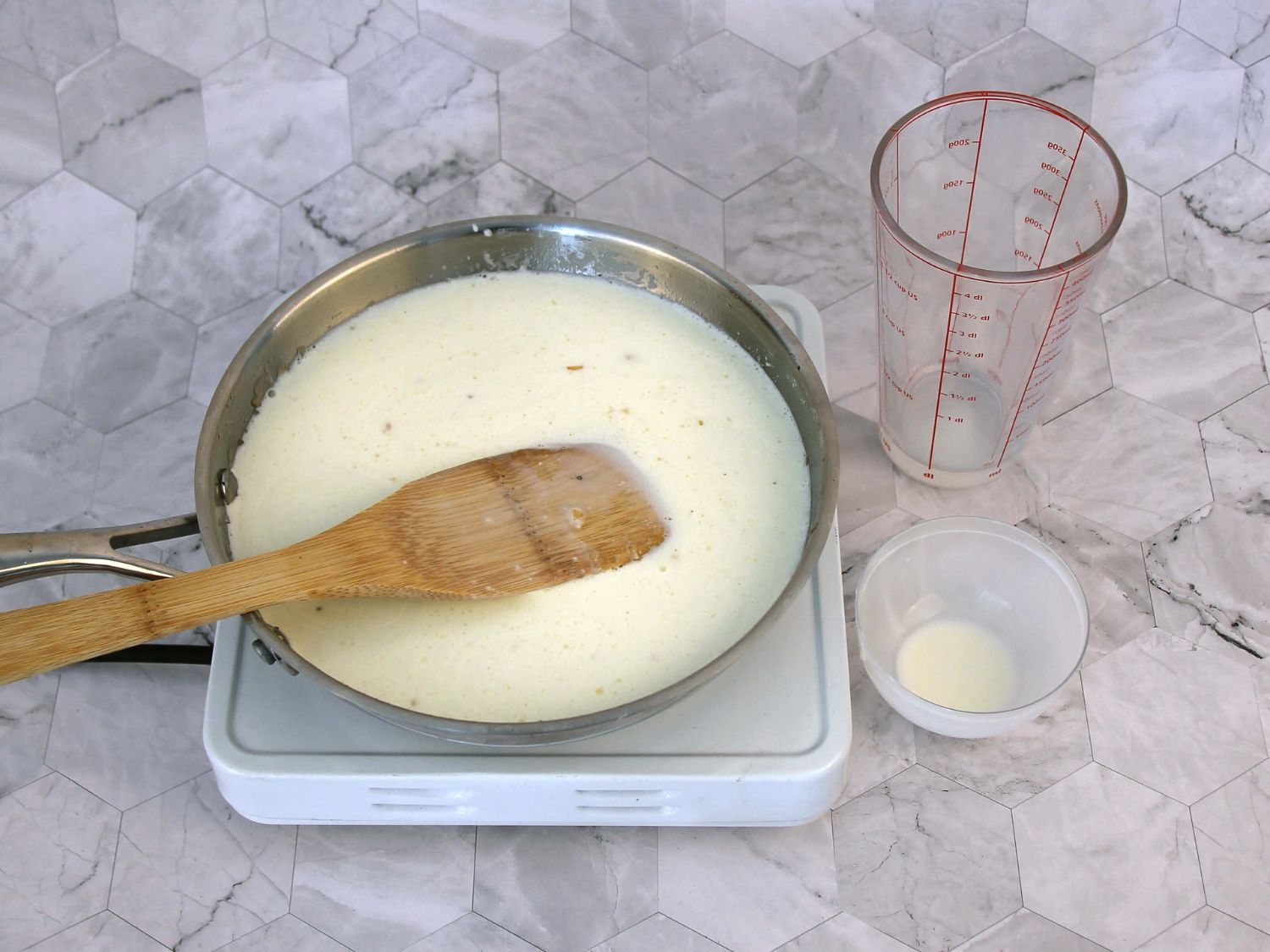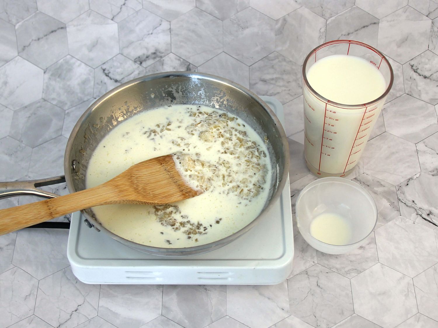 While stirring constantly, slowly stream the milk and cream into the onion and flour mixture. Let the milk come to a gentle simmer and continue cooking and stirring until the béchamel begins to thicken, approximately 3-4 minutes.Â