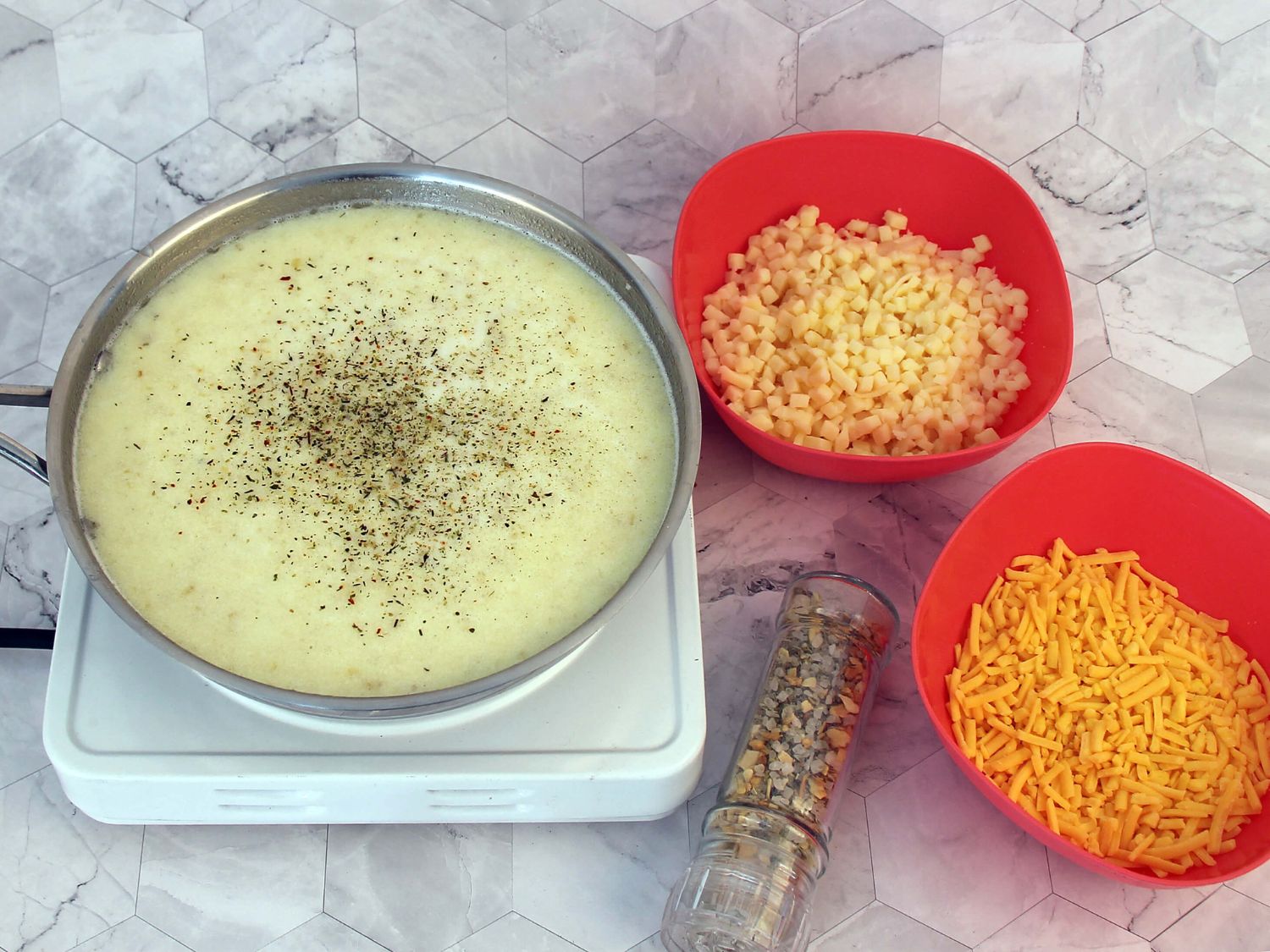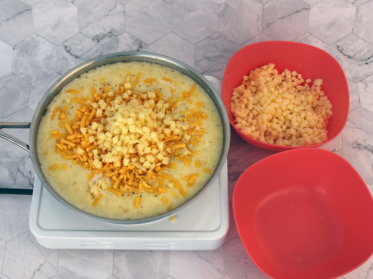 Stir in the Italian seasoning, cheddar, and one-half of the fontina cheese.