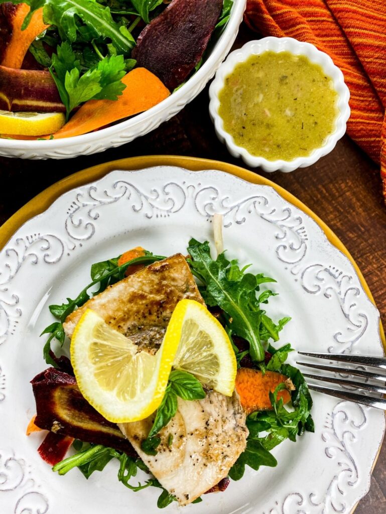 Garnish with lemon slices, if desired, and serve the remaining vinaigrette on the side.