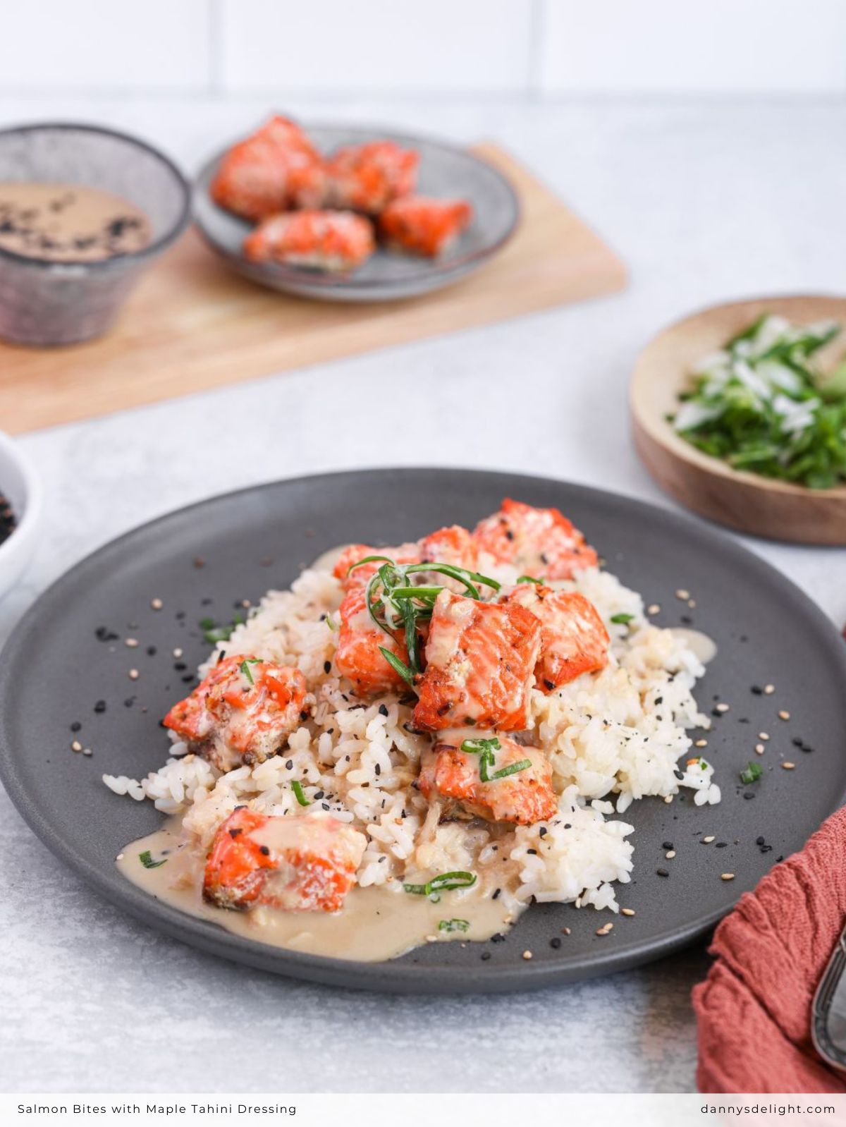Transfer the cooked salmon to a serving dish. Drizzle generously with maple tahini dressing, then garnish with sliced green onions and sesame seeds.