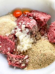 Add the beef, pork, onion, garlic, breadcrumbs, Parmesan cheese, eggs and whole milk to a large mixing bowl. Season with salt and black pepper, to taste.
