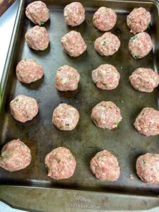 Use am ice cream or cookie scoop to divide the beef mixture into equal-sized portions on two rimmed baking sheets. Roll each portion into a compact round ball and arrange on the baking sheets without overcrowding, as shown.