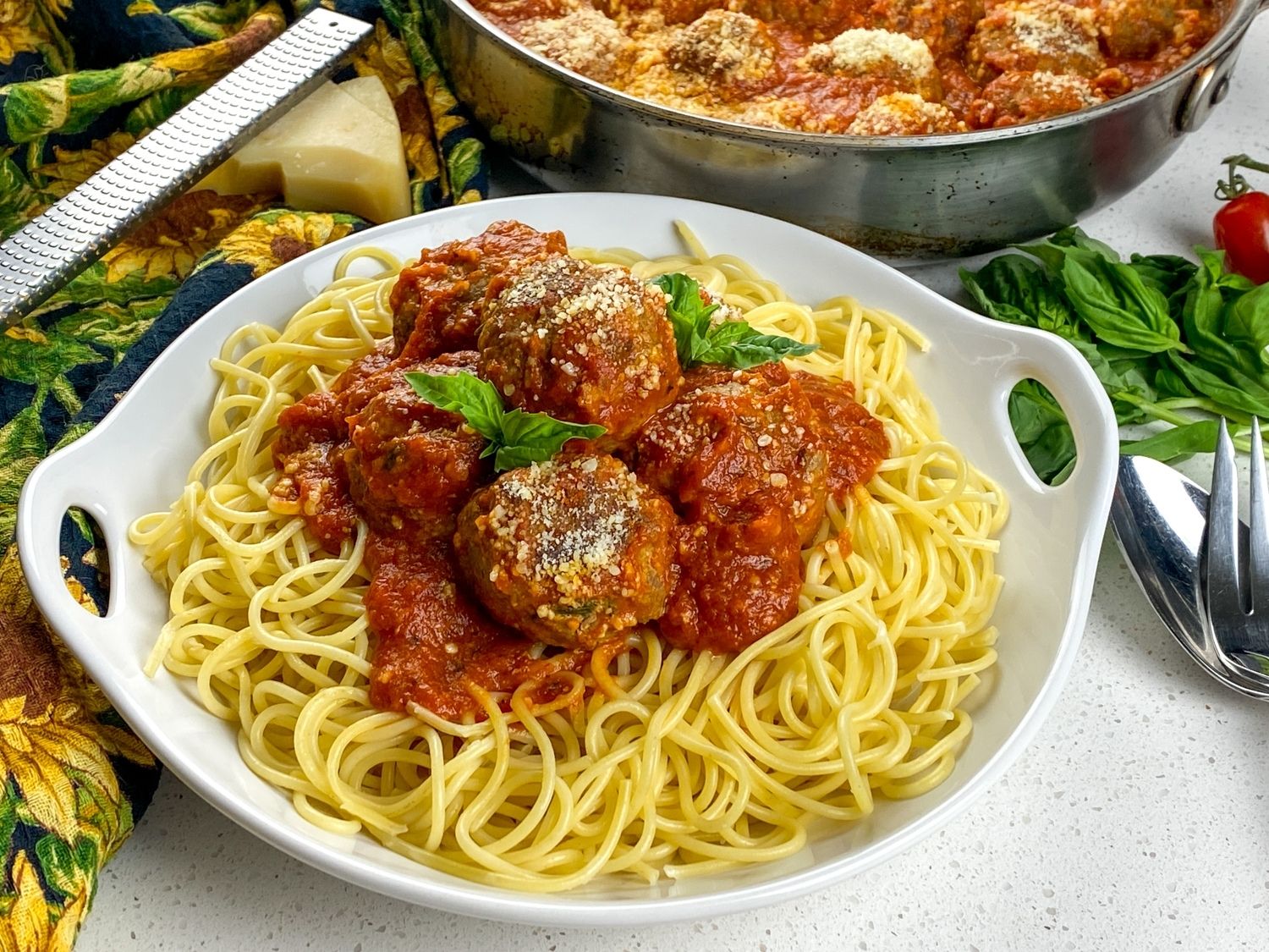 There’s nothing quite as satisfying as a pasta bowl cradling perfectly cooked, twirled and tangled, steaming spaghetti coated in a vibrant, garlicky, marinara sauce, all piled high and layered with homemade meatballs throughout! Talk about comfort food at its proudest!
