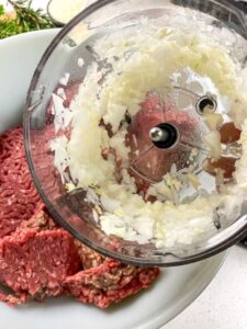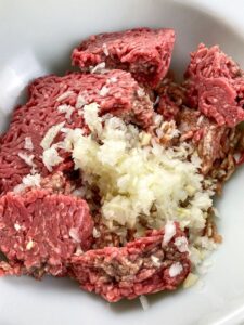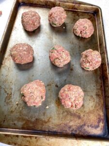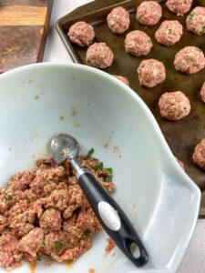 Use am ice cream or cookie scoop to divide the beef mixture into equal-sized portions on two rimmed baking sheets. Roll each portion into a compact round ball and arrange on the baking sheets without overcrowding, as shown.