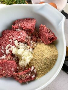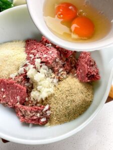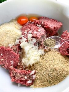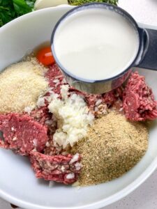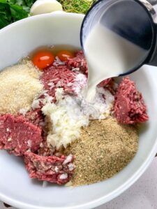 Add the beef, pork, onion, garlic, breadcrumbs, Parmesan cheese, eggs and whole milk to a large mixing bowl. Season with salt and black pepper, to taste.