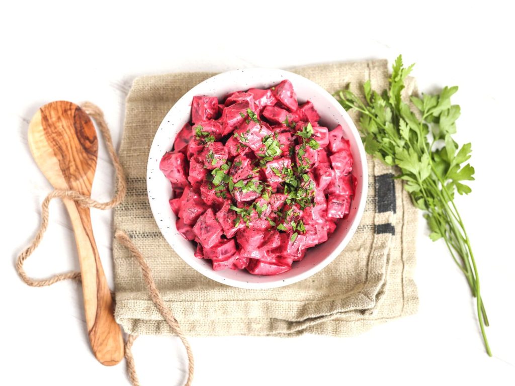 2 Mix the beetroots and 2/3 of the parsley with the yogurt and season with salt and pepper.
